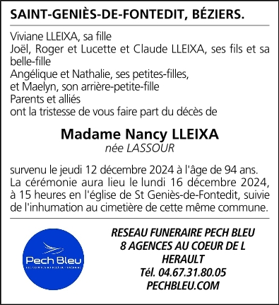 Décédée à Béziers (34500, France) le jeudi 12 décembre 2024 à l'âge de 94 ans