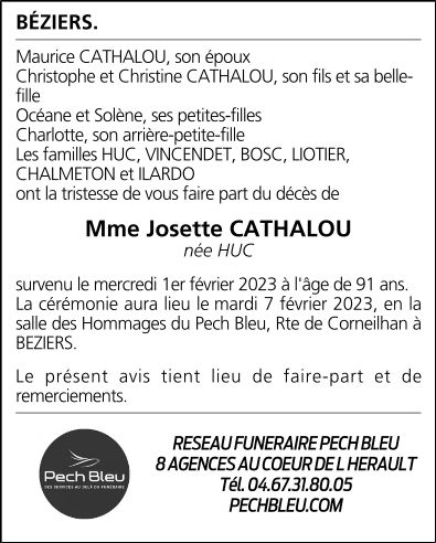 Décédée à Boujan-sur-Libron (34760, France) le mercredi 1 février 2023 à l'âge de 91 ans
