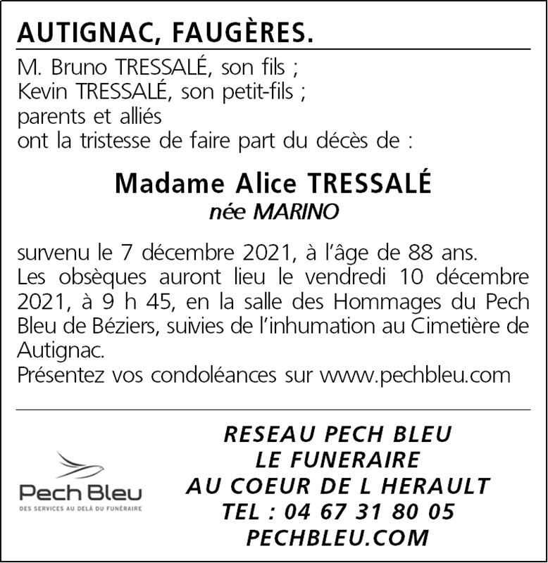 Décédée à Autignac (34480, France) le mardi 7 décembre 2021 à l'âge de 88 ans