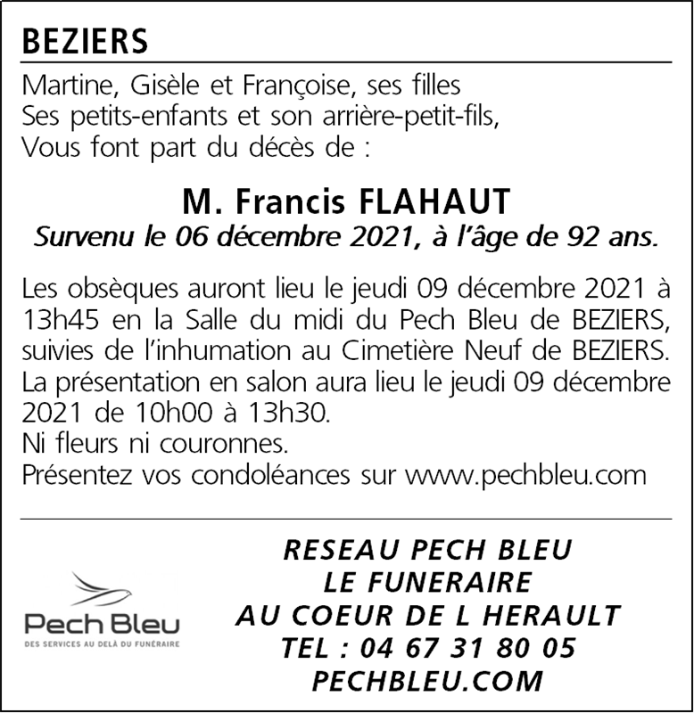 Décédé à Boujan-sur-Libron (34760, France) le lundi 6 décembre 2021 à l'âge de 92 ans