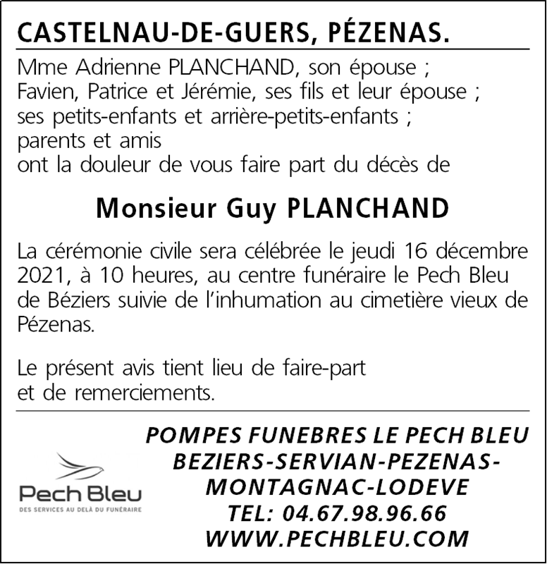 Décédé à Pézenas (34120, France) le vendredi 10 décembre 2021 à l'âge de 82 ans