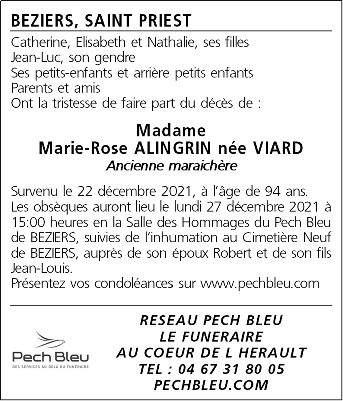 Décédée à Boujan-sur-Libron (34760, France) le mercredi 22 décembre 2021 à l'âge de 94 ans