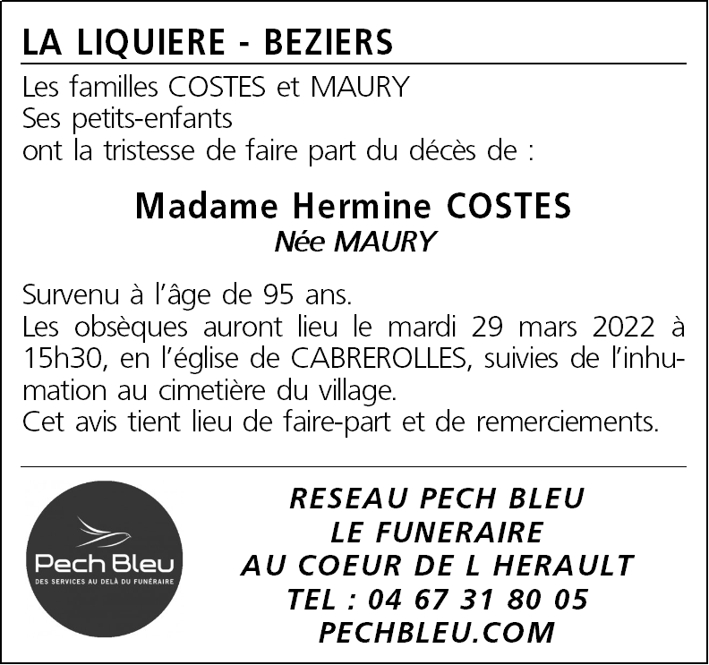 Décédée à Laurens (34480, France) le vendredi 25 mars 2022 à l'âge de 95 ans