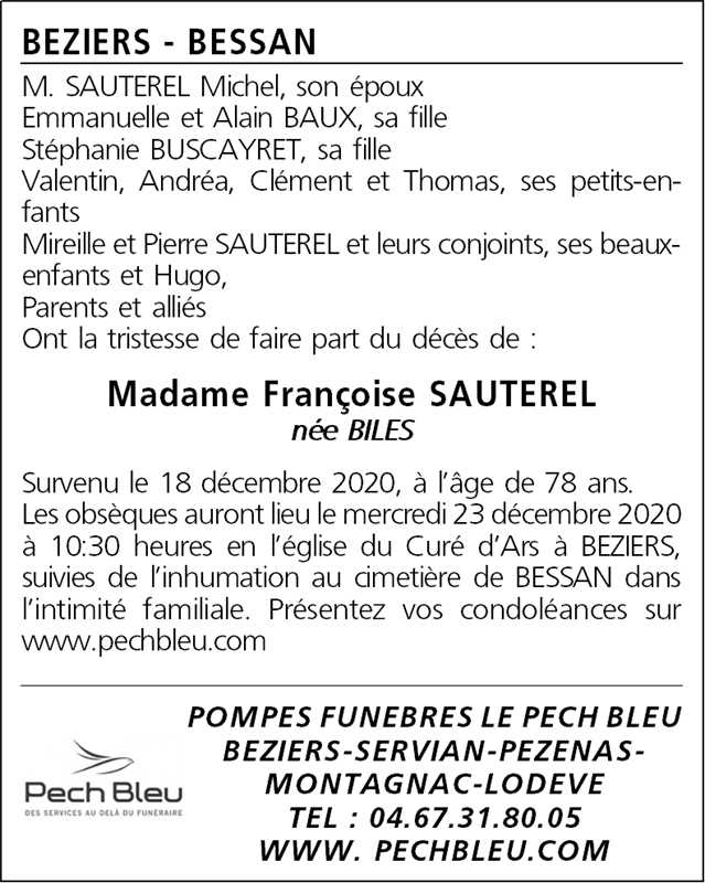 Décédée à Béziers (34500, France) le vendredi 18 décembre 2020 à l'âge de 78 ans