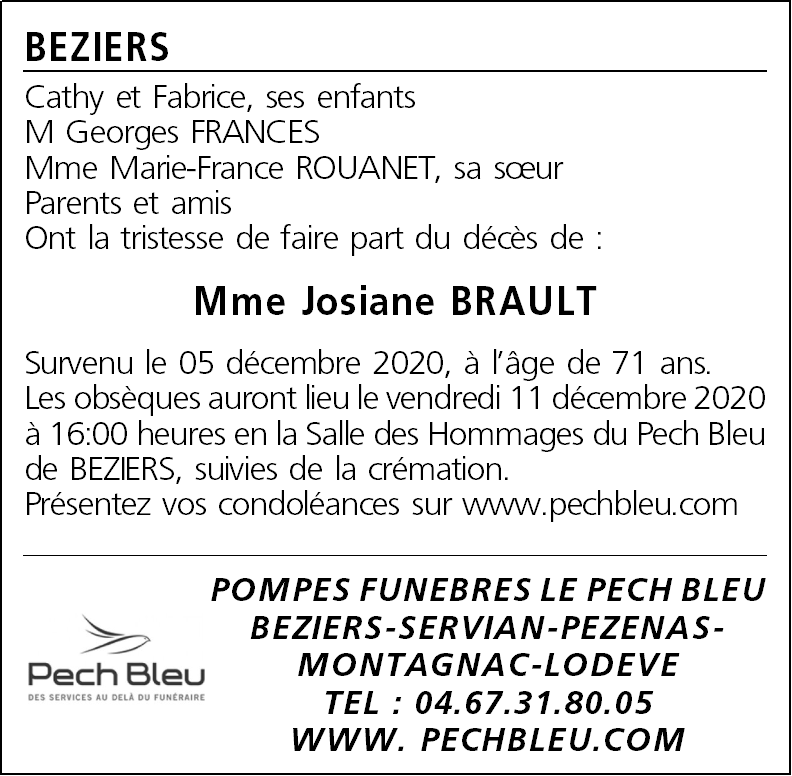 Décédée à Béziers (34500, France) le samedi 5 décembre 2020 à l'âge de 71 ans