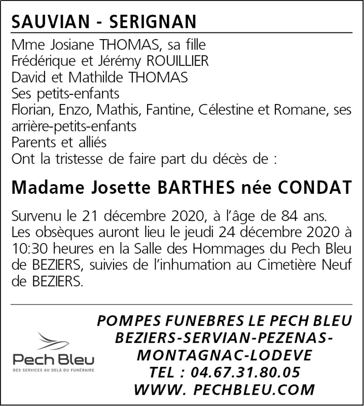 Décédée à Béziers (34500, France) le lundi 21 décembre 2020 à l'âge de 84 ans