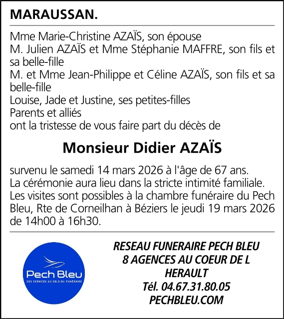 Décédé à Béziers (34500, France) le samedi 14 mars 2026 à l'âge de 67 ans