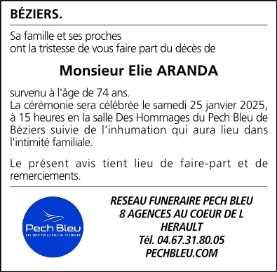 Décédé à Béziers (34500, France) le lundi 20 janvier 2025 à l'âge de 74 ans