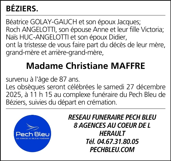 Décédée à Béziers (34500, France) le jeudi 18 décembre 2025 à l'âge de 87 ans