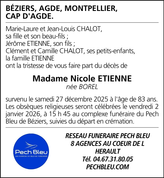 Décédée à Agde (34300, France) le samedi 27 décembre 2025 à l'âge de 83 ans