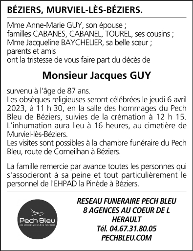 Décédé à Béziers (34500, France) le samedi 1 avril 2023 à l'âge de 87 ans