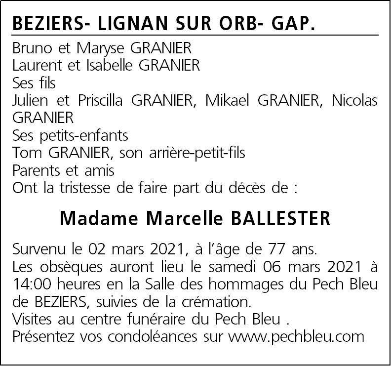 Décédée à Béziers (34500, France) le mardi 2 mars 2021 à l'âge de 77 ans