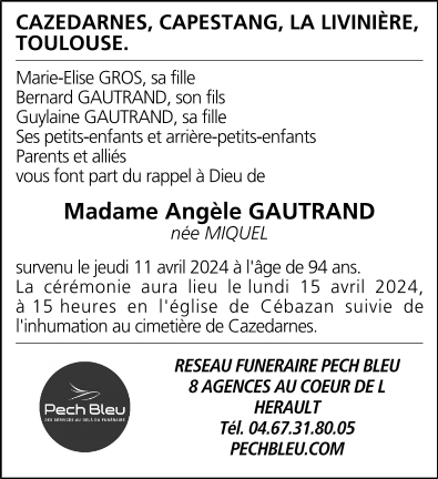 Décédée à Capestang (34310, France) le jeudi 11 avril 2024 à l'âge de 94 ans
