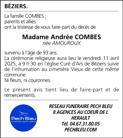 Décédée à Béziers (34500, France) le dimanche 6 avril 2025 à l'âge de 93 ans