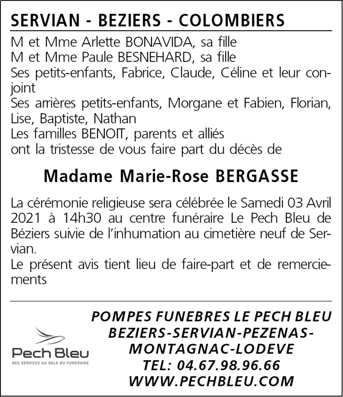 Décédée à Corneilhan (34490, France) le mardi 30 mars 2021 à l'âge de 94 ans