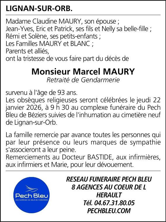 Décédé à Lignan-sur-Orb (34490, France) le jeudi 15 janvier 2026 à l'âge de 93 ans