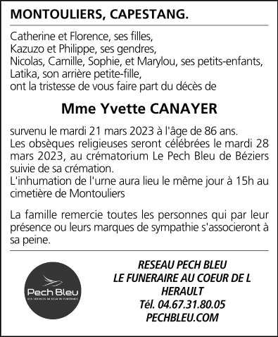 Décédée à Montredon-des-Corbières (11100, France) le mardi 21 mars 2023 à l'âge de 86 ans