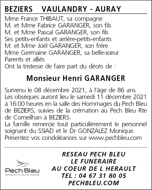 Décédé à Béziers (34500, France) le mercredi 8 décembre 2021 à l'âge de 86 ans