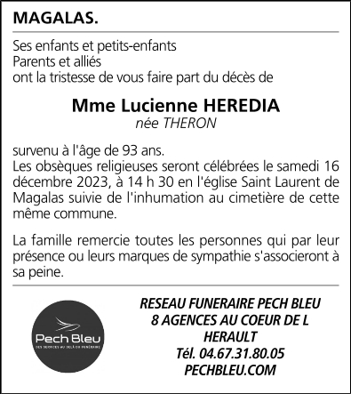 Décédée à Béziers (34500, France) le mardi 12 décembre 2023 à l'âge de 93 ans