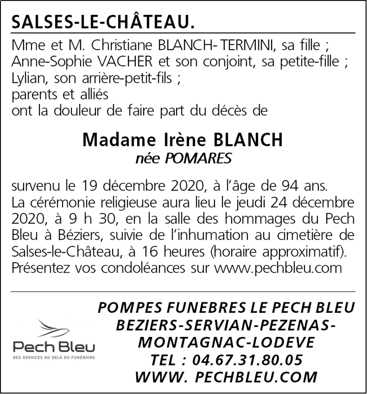 Décédée à Béziers (34500, France) le samedi 19 décembre 2020 à l'âge de 94 ans