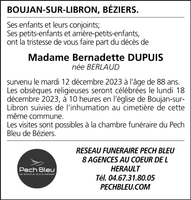 Décédée à Bédarieux (34600, France) le mardi 12 décembre 2023 à l'âge de 88 ans