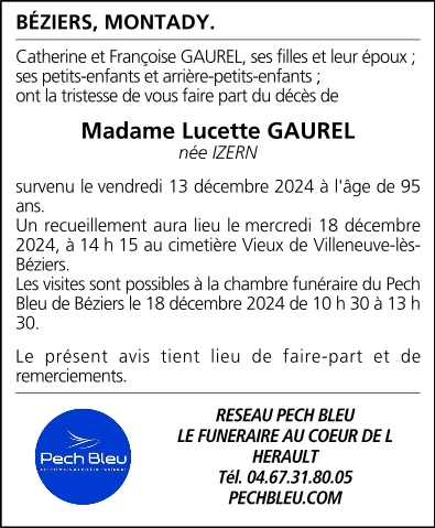 Décédée à Agde (34300, France) le vendredi 13 décembre 2024 à l'âge de 95 ans