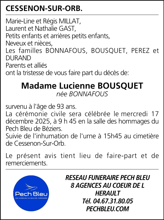 Décédée à Cessenon-sur-Orb (34460, France) le mercredi 10 décembre 2025 à l'âge de 93 ans