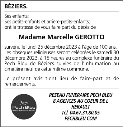 Décédée à Béziers (34500, France) le lundi 25 décembre 2023 à l'âge de 100 ans