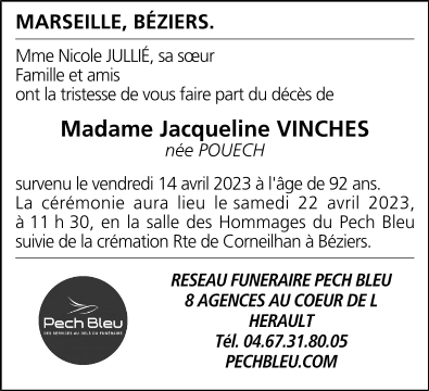 Décédée à Marseille (13008, France) le vendredi 14 avril 2023 à l'âge de 92 ans