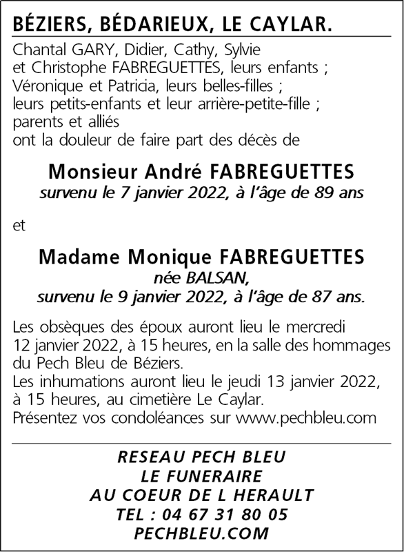 Décédée à Béziers (34500, France) le dimanche 9 janvier 2022 à l'âge de 87 ans
