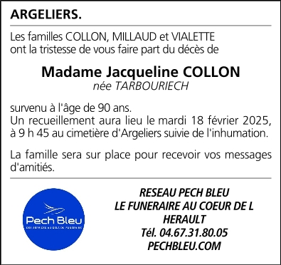 Décédée à Argeliers (11120, France) le jeudi 13 février 2025 à l'âge de 90 ans