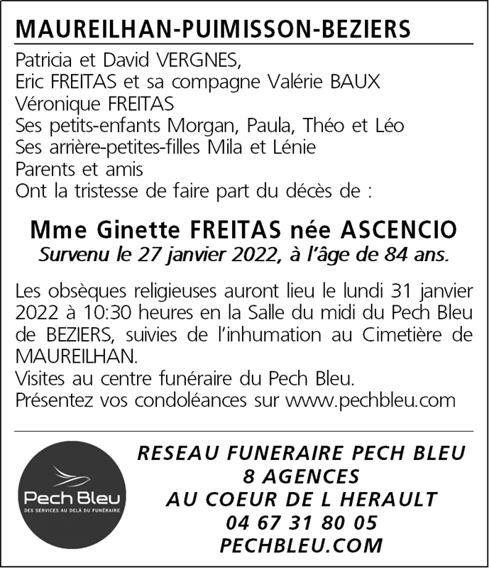 Décédée à Béziers (34500, France) le jeudi 27 janvier 2022 à l'âge de 84 ans