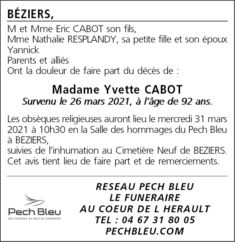 Décédée à Béziers (34500, France) le vendredi 26 mars 2021 à l'âge de 92 ans