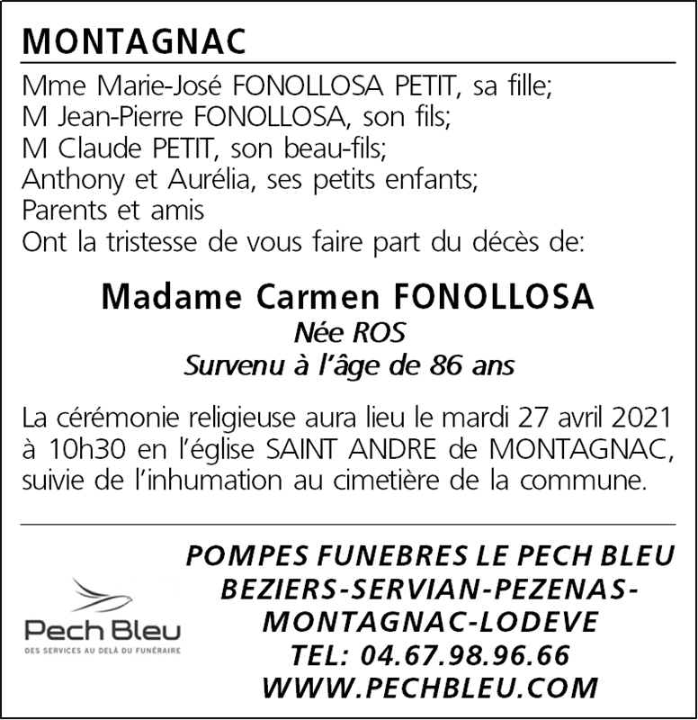Décédée à Béziers (34500, France) le mercredi 21 avril 2021 à l'âge de 86 ans
