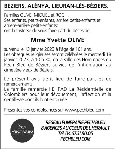 Décédée à Colombiers (34440, France) le vendredi 13 janvier 2023 à l'âge de 101 ans