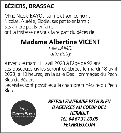 Décédée à Béziers (34500, France) le mardi 11 avril 2023 à l'âge de 92 ans