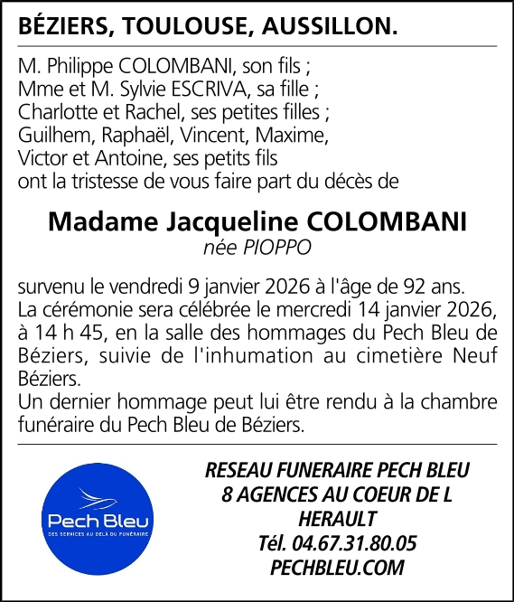 Décédée à Béziers (34500, France) le vendredi 9 janvier 2026 à l'âge de 92 ans