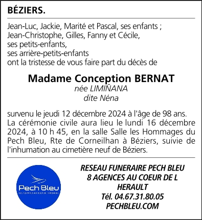 Décédée à Béziers (34500, France) le jeudi 12 décembre 2024 à l'âge de 98 ans