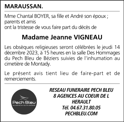 Décédée à Corneilhan (34490, France) le dimanche 10 décembre 2023 à l'âge de 92 ans