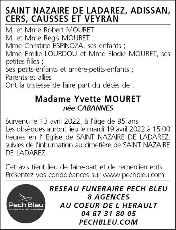 Décédée à Boujan-sur-Libron (34760, France) le mercredi 13 avril 2022 à l'âge de 95 ans