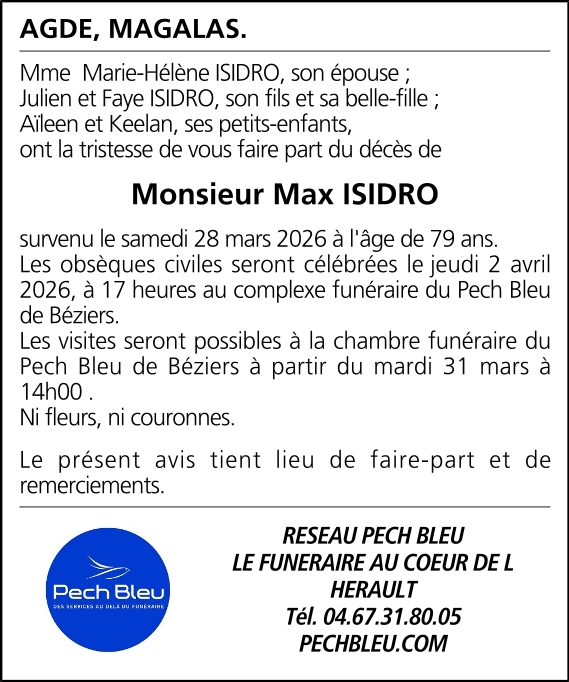 Décédé à Agde (34300, France) le samedi 28 mars 2026 à l'âge de 79 ans