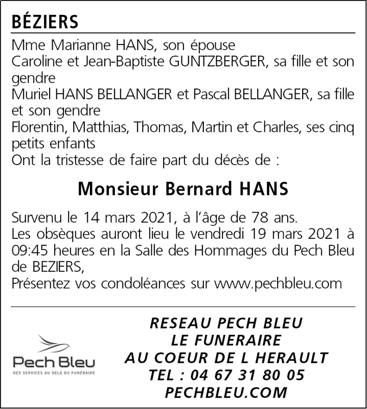 Décédé à Béziers (34500, France) le dimanche 14 mars 2021 à l'âge de 78 ans