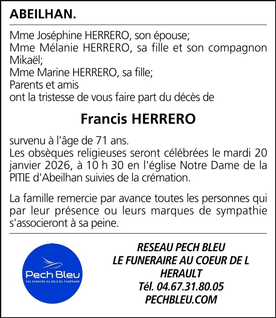Décédé à Abeilhan (34290, France) le mercredi 14 janvier 2026 à l'âge de 71 ans