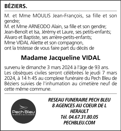 Décédée à Béziers (34500, France) le dimanche 3 mars 2024 à l'âge de 93 ans