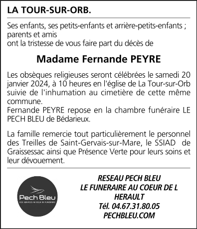 Décédée à Saint-Gervais-sur-Mare (34610, France) le dimanche 14 janvier 2024 à l'âge de 97 ans