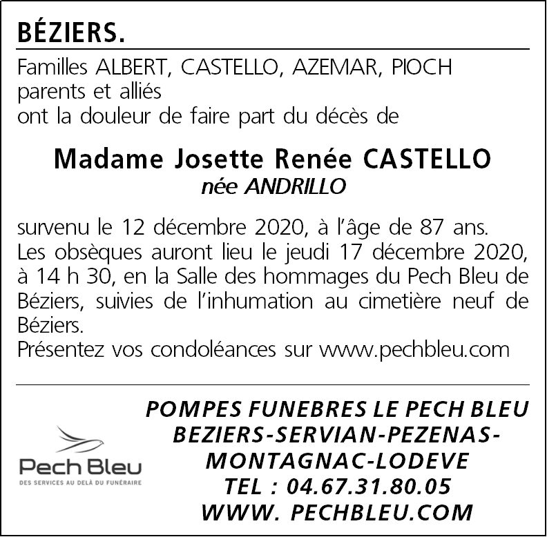 Décédée à Béziers (34500, France) le samedi 12 décembre 2020 à l'âge de 87 ans