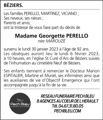 Décédée à Béziers (34500, France) le lundi 30 janvier 2023 à l'âge de 92 ans