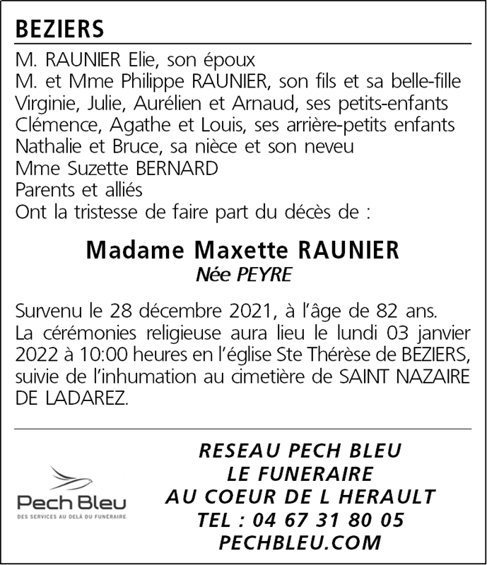 Décédée à Béziers (34500, France) le mardi 28 décembre 2021 à l'âge de 82 ans