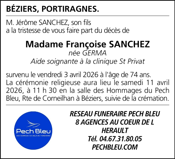 Décédée à Béziers (34500, France) le vendredi 3 avril 2026 à l'âge de 74 ans
