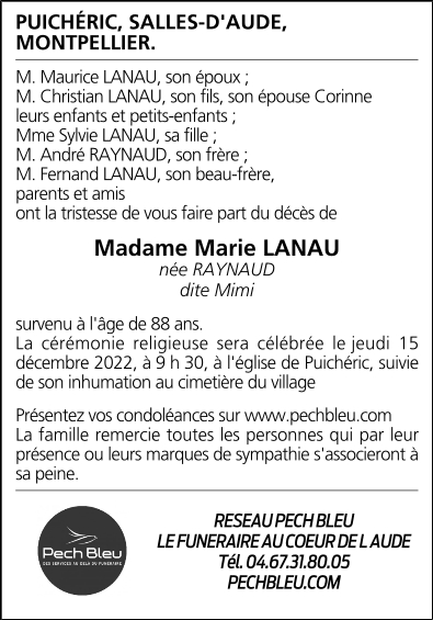 Décédée à Salles-d'Aude (11110, France) le samedi 10 décembre 2022 à l'âge de 88 ans